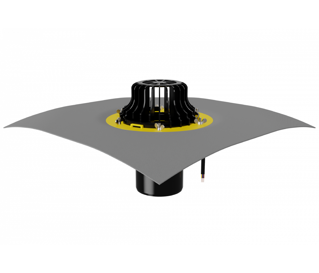 Кровельная обогреваемая воронка с листвоуловителем и металлическим обжимным фланцем с вертикальным выпуском используется при устройстве водоотвода с кровли. Благодаря коррозионностойкому металлическому прижимному фланцу, с зоной прижатия шириной 45 мм, выдерживает большие нагрузки. Механический способ соединения кровельного полотна с воронкой применим для всех типов гидроизоляционных материалов.