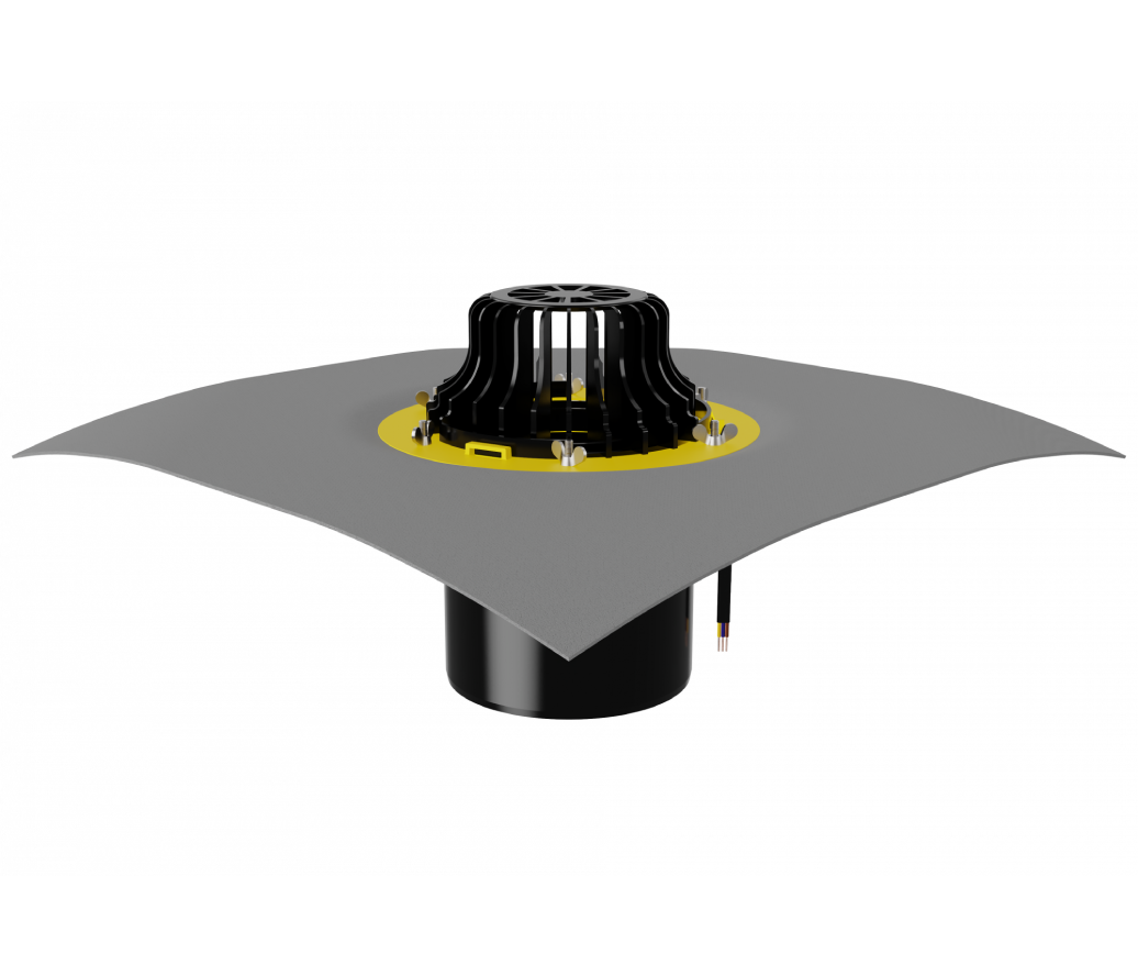 Кровельная обогреваемая воронка с листвоуловителем и металлическим обжимным фланцем с вертикальным выпуском используется при устройстве водоотвода с кровли. Благодаря коррозионностойкому металлическому прижимному фланцу, с зоной прижатия шириной 45 мм, выдерживает большие нагрузки. Механический способ соединения кровельного полотна с воронкой применим для всех типов гидроизоляционных материалов.