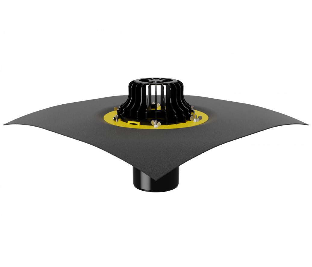 Кровельная воронка с листвоуловителем и металлическим обжимным фланцем с вертикальным выпуском используется при устройстве водоотвода с кровли. Благодаря коррозионностойкому металлическому прижимному фланцу, с зоной прижатия шириной 45 мм, выдерживает большие нагрузки. Механический способ соединения кровельного полотна с воронкой применим для всех типов гидроизоляционных материалов.