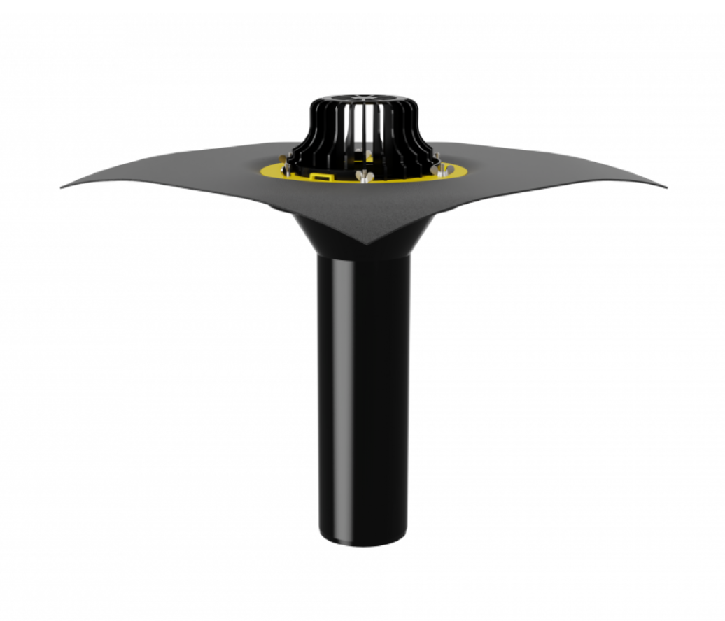 Кровельная воронка с листвоуловителем и металлическим обжимным фланцем с вертикальным выпуском используется при устройстве водоотвода с кровли. Благодаря коррозионностойкому металлическому прижимному фланцу, с зоной прижатия шириной 45 мм, выдерживает большие нагрузки. Механический способ соединения кровельного полотна с воронкой применим для всех типов гидроизоляционных материалов.