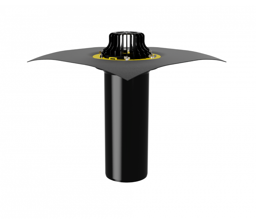 Комплектуется битумным фартуком и металлическим фланцем, которые обеспечивают надежное соединение с кровельным материалом, а также шестигранными гайками и барашками для удобства монтажа.