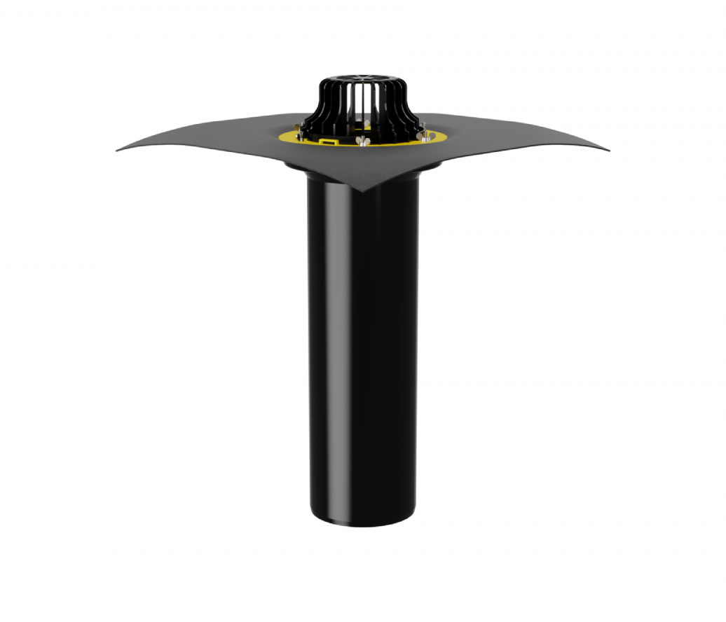 Комплектуется битумным фартуком и металлическим фланцем, которые обеспечивают надежное соединение с кровельным материалом, а также шестигранными гайками и барашками для удобства монтажа.