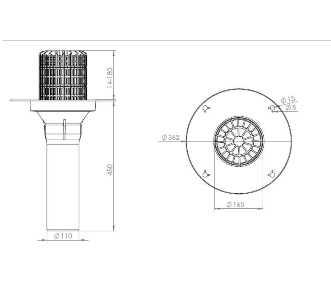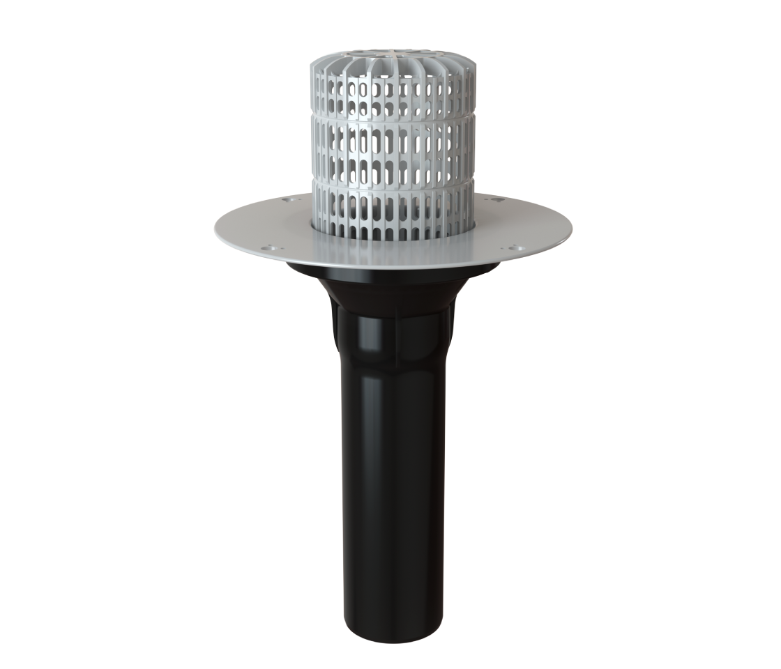 Кровельная воронка с корпусом из ПВХ и листвоуловителем, с удлиненным вертикальным выпускным патрубком из ударопрочного ПП, используется для отвода дождевой и талой воды с плоских кровель во внутренний водосток дождевой канализации