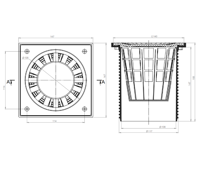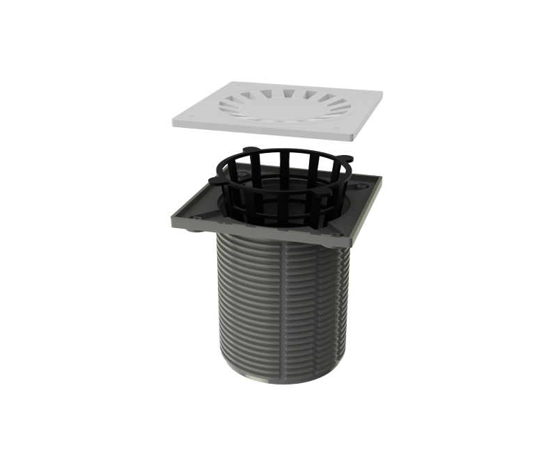 Может комплектоваться уплотнительной манжетой арт. 01.064 и дренажным кольцом арт. 01.065 (путем переворота листвоуловителя нижней воронки на 180°)