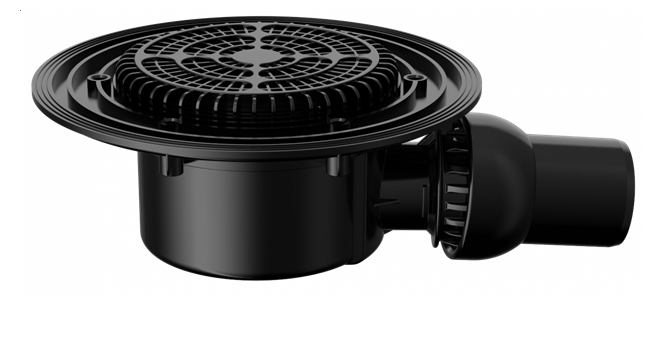 F Воронка кровельная горизонтальная с регулируемым углом выпуска, плоским листвоуловителем для эксплуатируемых кровель, без прижимного фланца