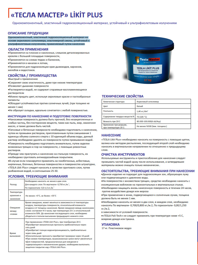 «ТЕСЛА МАСТЕР» LİKİT PLAST Однокомпонентный, эластичный гидроизоляционный материал, устойчивый к ультрафиолетовым излучениям ОБЛАСТИ ПРИМЕНЕНИЯ Применяется на плоских и наклонных, слишком детализированных кровлях с большой площадью поверхности, ·Применяется на сливах террас и балконов, ·Применяется в каналах и лотках, ·Применяется для гидроизоляции края дымоходов, карнизов, желобов и водостоков. Расход Необходимо наносить не менее в два слоя. Для каждого слоя: По вертикали- 0,750 кг./м2 По горизонтали- 0,0-1,5 кг./м2