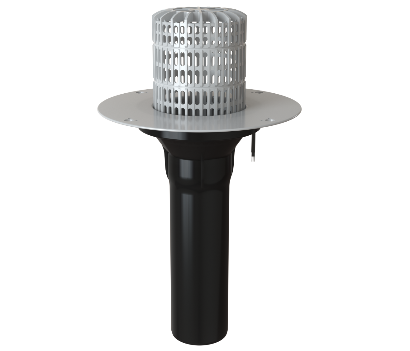 Кровельная воронка обогреваемая с корпусом из ПВХ и листвоуловителем, с удлиненным вертикальным выпускным патрубком из ПП, используется для отвода дождевой и талой воды с плоских кровель во внутренний водосток дождевой канализации.