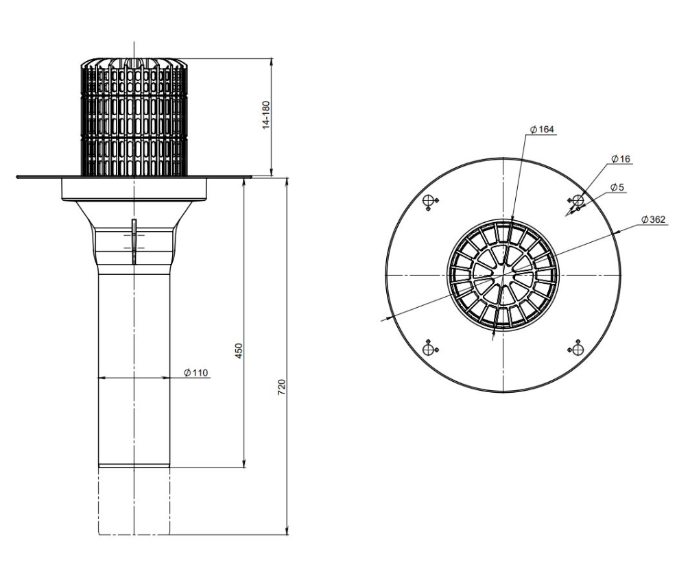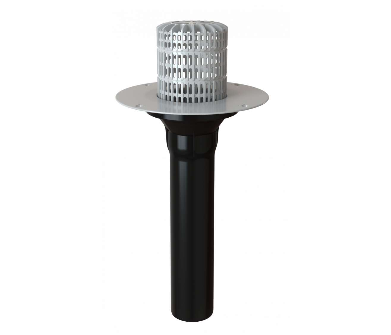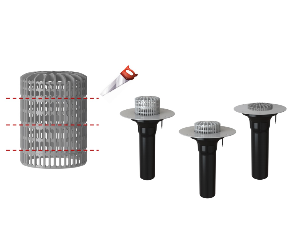 Кровельная воронка с корпусом из ПВХ и листвоуловителем, с удлиненным вертикальным выпускным патрубком из ударопрочного ПП, используется для отвода дождевой и талой воды с плоских кровель во внутренний водосток дождевой канализации.