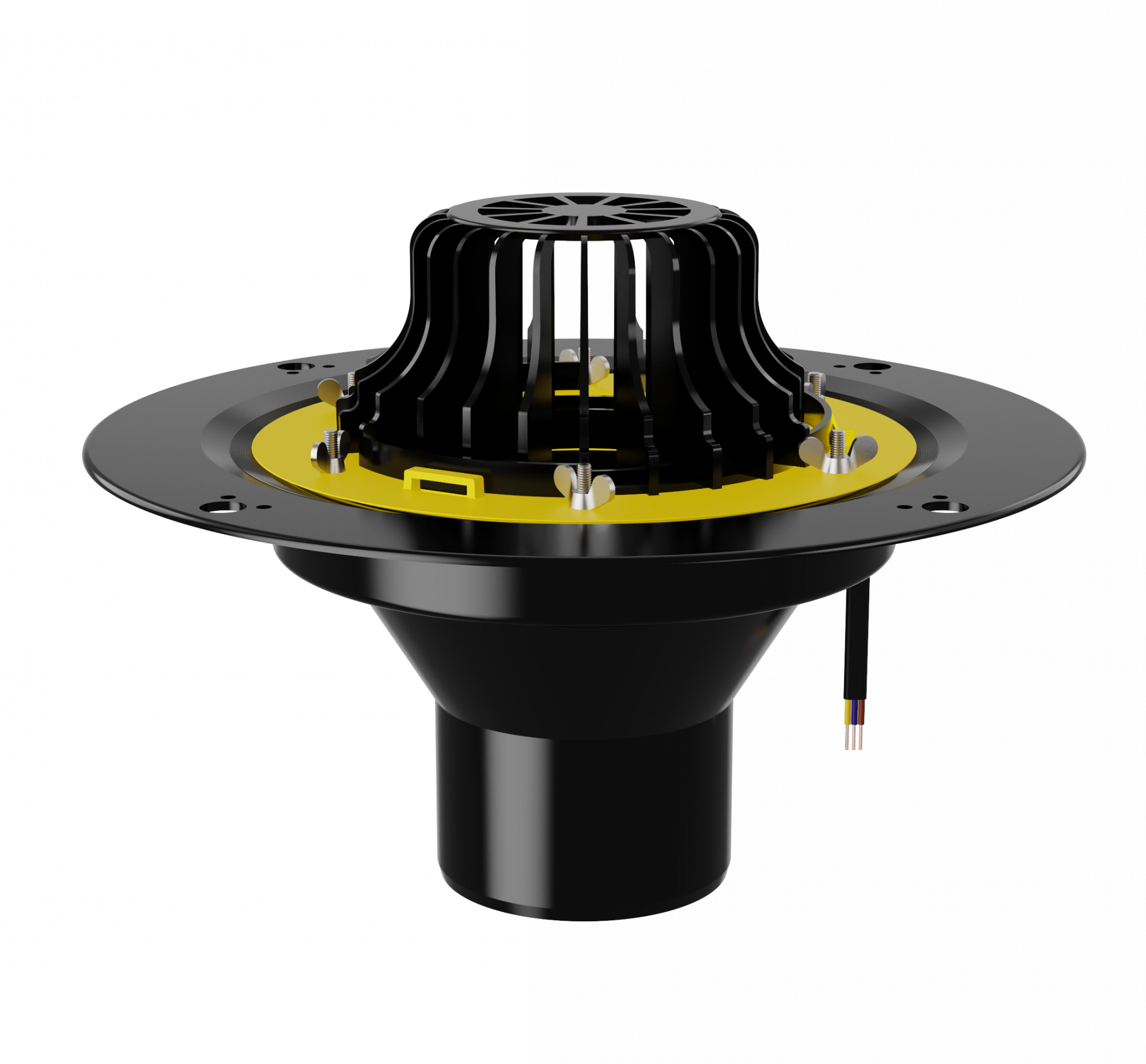 Обогреваемая кровельная воронка с листвоуловителем и металлическим обжимным фланцем с вертикальным выпуском используется при устройстве водоотвода c кровли.