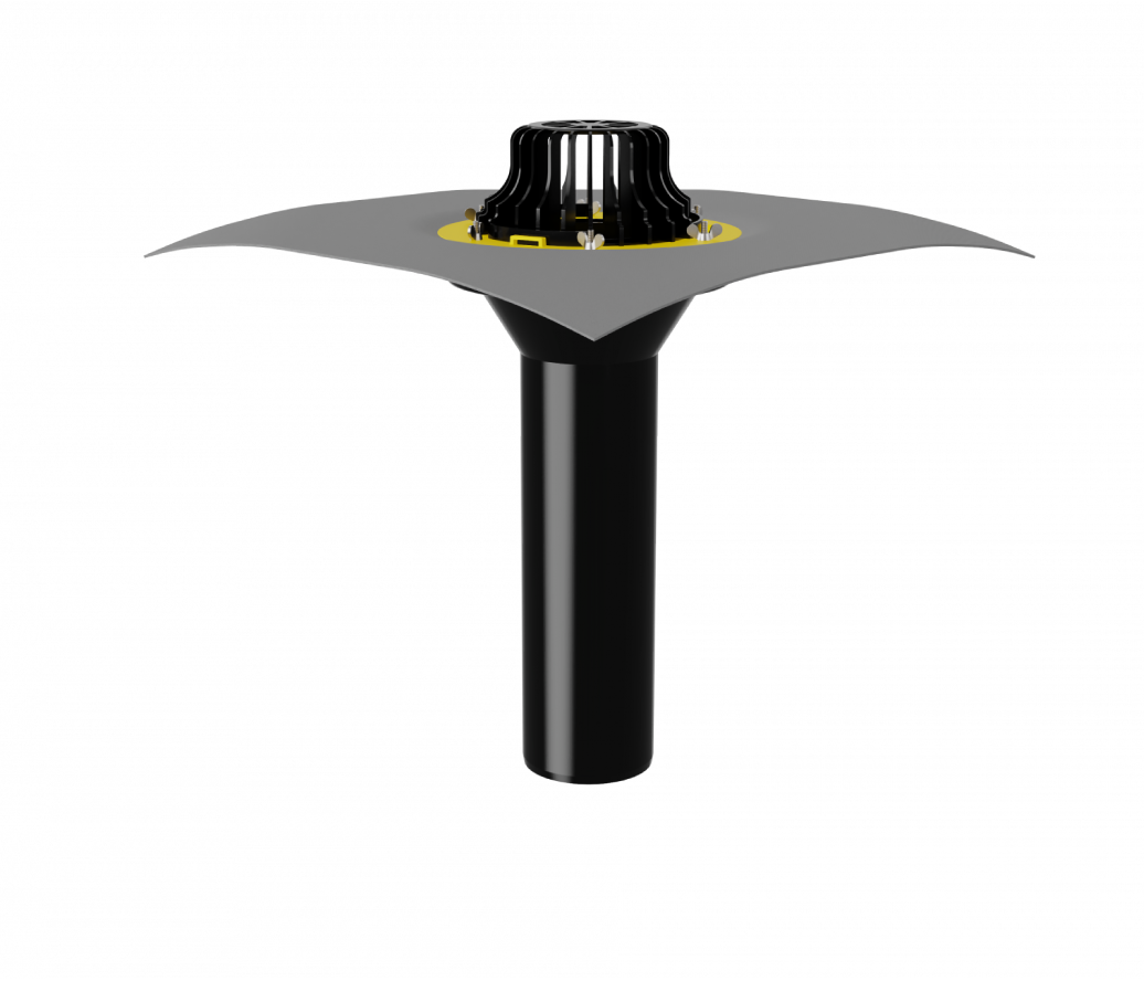 Кровельная воронка с листвоуловителем и металлическим обжимным фланцем с вертикальным выпуском используется при устройстве водоотвода с кровли. Благодаря коррозионностойкому металлическому прижимному фланцу, с зоной прижатия шириной 45 мм, выдерживает большие нагрузки. Механический способ соединения кровельного полотна с воронкой применим для всех типов гидроизоляционных материалов.